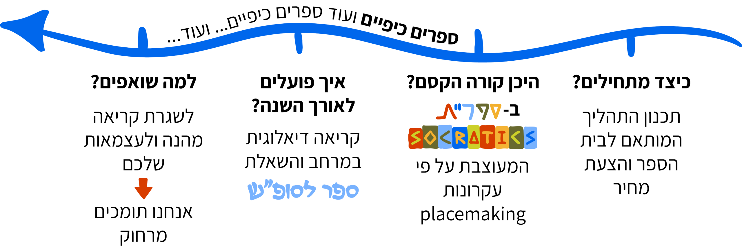 אנו מטפחים אהבת קריאה שהופכת להרגל מהנה בשעות הפנאי – בבית הספר וגם בבית – באמצעות קריאה דיאלוגית עם ספרים כיפיים, במרחב מעוצב ומותאם לקהל היעד. את התהליך מוציאים לפועל אוריינאים בעלי תארים אקדמיים מהארץ ומחו״ל, המתמחים בספרות ילדים ובעיצוב ספריות שיוצרות תנאים לחוויות קריאה משמעותיות.